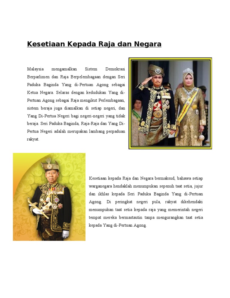 Contoh Taat Setia Kepada Raja Dan Negara Rakyat Perlu Tumpah Taat Setia Kepada Kepimpinan Agong Corak Pemerintahan Secara Demokrasi Berparlimen Adalah Bukti Penglibatan Rakyat Dalam Pentadbiran Negara Serta Taat Setia